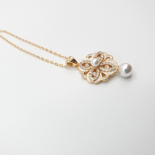 Vintage Style Enamel and 2 Pearl - Mother Pearl Floral Pendant Necklace